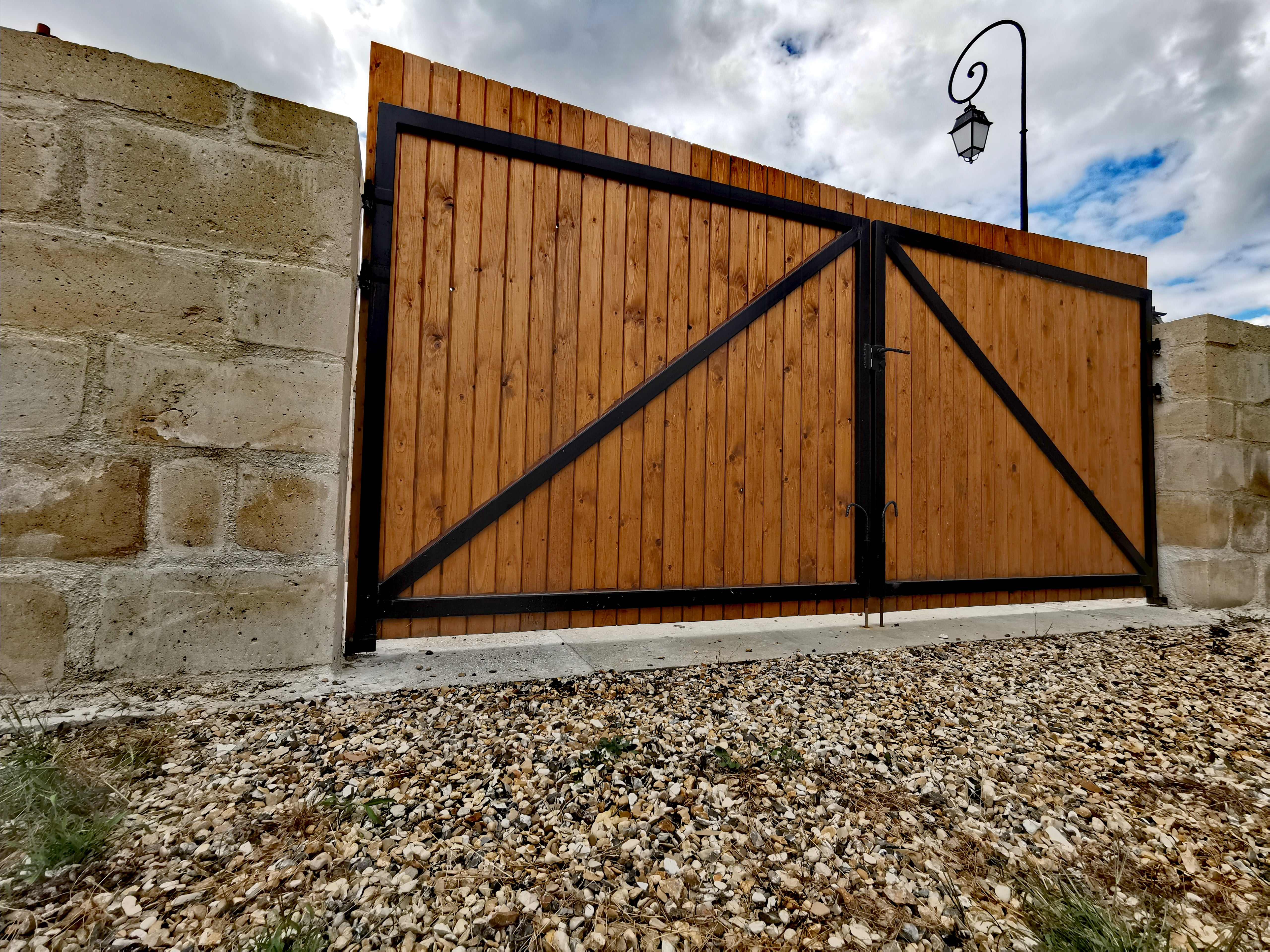 Portail extérieur en bois massif, pin du nord, traité au saturateur spécial bois extérieur. Châssis en acier traité anti-rouille et peint.